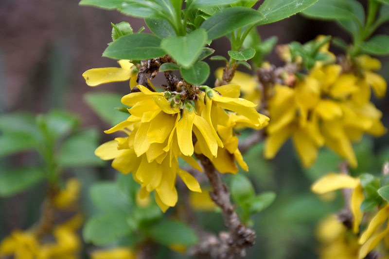 A stunning compact forsythia with short internodes; features abundant flowers in early spring, followed by dark green foliage; quite hardy, and suitable for containers; makes a great low hedge