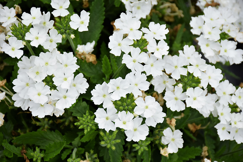 Lanai® Upright White Verbena will grow to be about 16 inches tall at maturity, with a spread of 16 inches. When grown in masses or used as a bedding plant, individual plants should be spaced approximately 12 inches apart. Its foliage tends to remain dense right to the ground, not requiring facer plants in front. Although it's not a true annual, this fast-growing plant can be expected to behave as an annual in our climate if left outdoors over the winter, usually needing replacement the following year. As such, gardeners should take into consideration that it will perform differently than it would in its native habitat.
