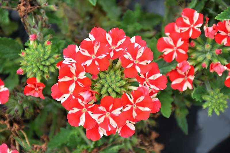 Voodoo™ Red Star Verbena features showy clusters of red star-shaped flowers with white stripes at the ends of the stems from early spring to mid fall. Its small serrated pointy leaves remain green in colour throughout the season.