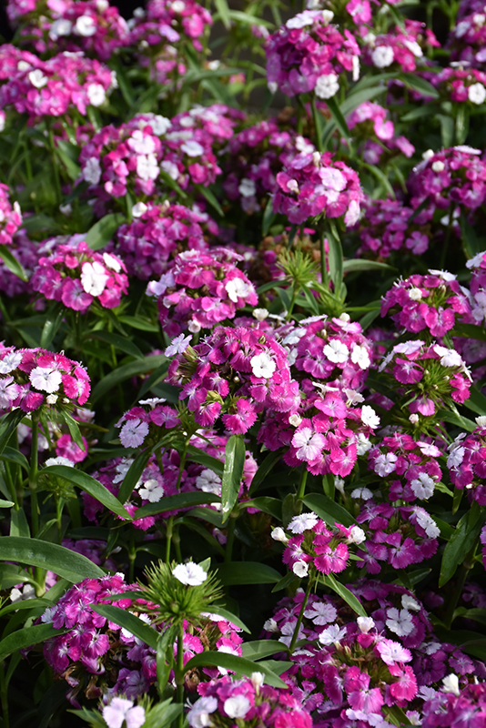 Dash™ Magician Sweet William will grow to be about 15 inches tall at maturity extending to 20 inches tall with the flowers, with a spread of 14 inches. When grown in masses or used as a bedding plant, individual plants should be spaced approximately 10 inches apart. Its foliage tends to remain dense right to the ground, not requiring facer plants in front. It grows at a medium rate, and tends to be biennial, meaning that it puts on vegetative growth the first year, flowers the second, and then dies. However, this species tends to self-seed and will thereby endure for years in the garden if allowed. As an herbaceous perennial, this plant will usually die back to the crown each winter, and will regrow from the base each spring. Be careful not to disturb the crown in late winter when it may not be readily seen!