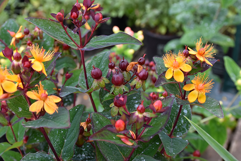 Miracle® Night St. John's Wort has masses of beautiful yellow buttercup flowers at the ends of the branches from late spring to early summer, which are most effective when planted in groupings. The flowers are excellent for cutting. It features an abundance of magnificent crimson berries from mid summer to mid fall. It has dark red-variegated dark green foliage. The pointy leaves do not develop any appreciable fall colour. The crimson stems can be quite attractive.