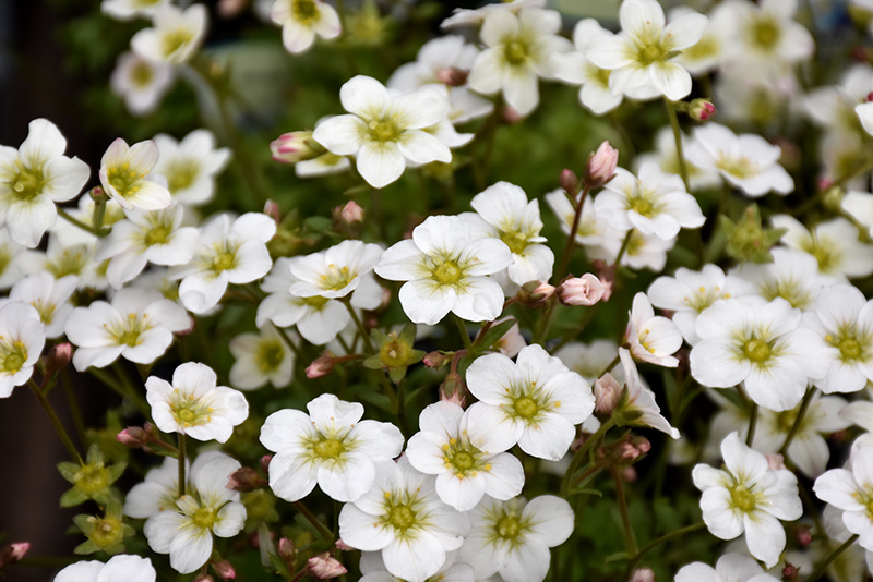 Alpino™ Early White Saxifrage has masses of beautiful white star-shaped flowers with chartreuse eyes at the ends of the stems from early spring to early summer, which emerge from distinctive pink flower buds, and which are most effective when planted in groupings. Its needle-like leaves remain emerald green in colour throughout the season.