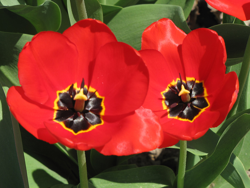Red Apeldoorn Tulip has masses of beautiful lightly-scented red cup-shaped flowers with black eyes and a yellow ring at the ends of the stems in mid spring, which are most effective when planted in groupings. The flowers are excellent for cutting. Its sword-like leaves remain green in colour throughout the season.