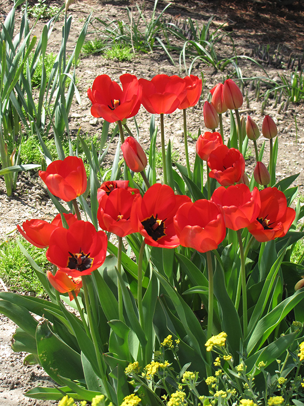 Red Apeldoorn Tulip will grow to be about 15 inches tall at maturity extending to 24 inches tall with the flowers, with a spread of 12 inches. When grown in masses or used as a bedding plant, individual plants should be spaced approximately 6 inches apart. It grows at a medium rate, and under ideal conditions can be expected to live for approximately 10 years. As an herbaceous perennial, this plant will usually die back to the crown each winter, and will regrow from the base each spring. Be careful not to disturb the crown in late winter when it may not be readily seen! As this plant tends to go dormant in summer, it is best interplanted with late-season bloomers to hide the dying foliage.