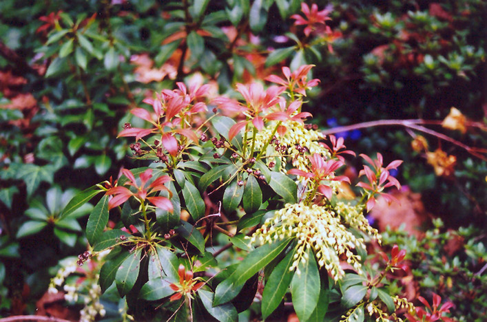 A highly ornamental broadleaf evergreen shrub, prized for its very delicate and showy chains of small creamy white bell-shaped flowers and very colorful emerging foliage; performs best in moist, organic and acidic soils