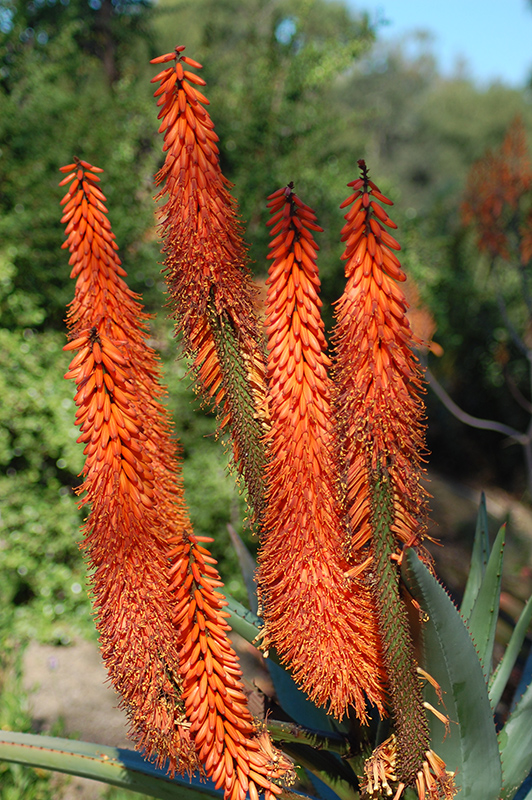Cat's Tail Aloe features showy spikes of orange tubular flowers with brown overtones rising above the foliage in mid winter. It has attractive bluish-green foliage with hints of silver. The large succulent sword-like leaves are highly ornamental and remain bluish-green throughout the winter.