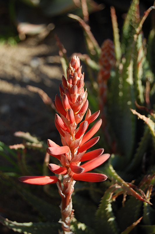 A medium-sized clumping selection producing numerous rosettes of long, lightly spotted dark green leaves that twist and curl; red flowers on unbranched spikes in winter; a wonderful garden or container accent