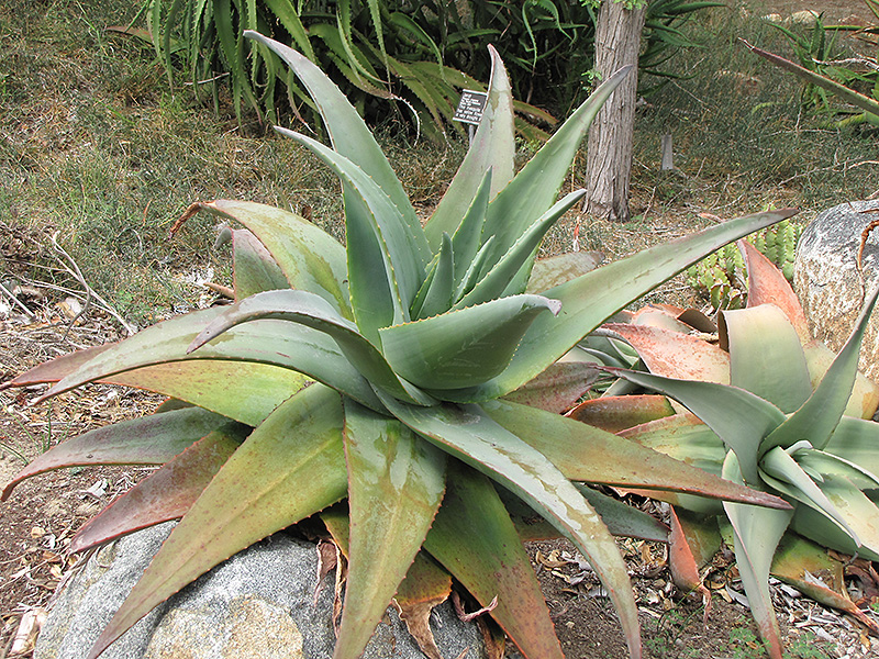 Stunning, large rosettes of succulent, toothed, sword shaped blue-green leaves that flush pink in cooler weather; produces erect racemes of tubular orange-red flowers in late fall into winter; a wonderful garden or container accent
