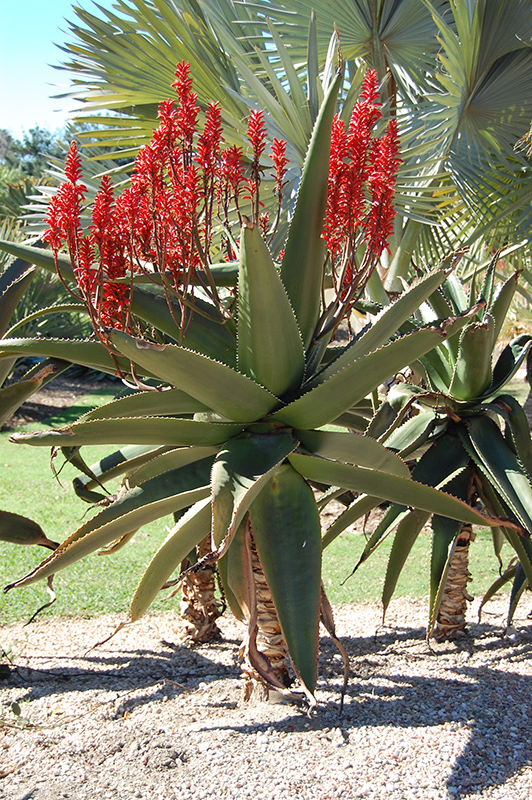 An unbranched tree variety with an impressive, large, solitary rosette of smooth green leaves with white teeth, that take on red tones in winter; produces erect, branched racemes of fiery red tubular flowers in mid winter; a fantastic landscape accent