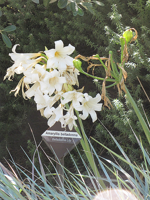 White Belladonna Lily is an herbaceous evergreen perennial with a rigidly upright and towering form. Its medium texture blends into the garden, but can always be balanced by a couple of finer or coarser plants for an effective composition.