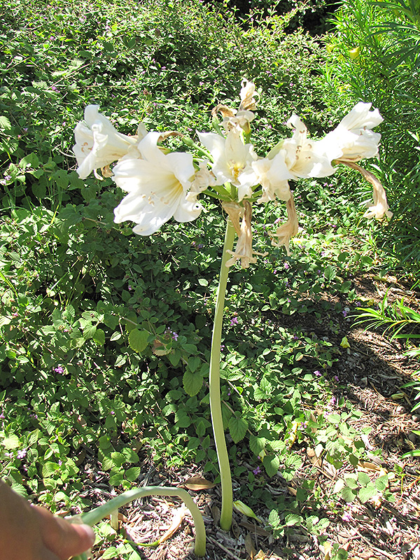 A stunning amaryllis that is quite vigorous; extraordinary white trumpet flowers emerge before the leaves on tall stems, making a bold visual statement in the garden or containers; toxic to wildlife, so critters will leave them alone; a great cut flower
