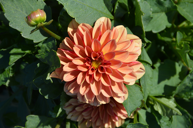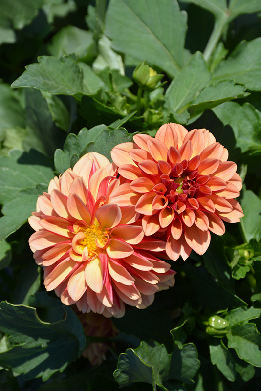 Labella® Grande Orange Bicolor Dahlia features showy double orange round flowers with gold overtones and yellow centers at the ends of the stems from mid summer to early fall. The flowers are excellent for cutting. Its serrated pointy leaves remain green in colour throughout the season.
