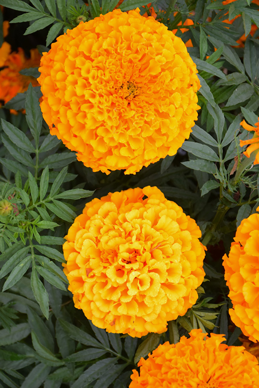 Proud Mari Orange Marigold features bold double orange ball-shaped flowers rising above the foliage from early summer to mid fall. The flowers are excellent for cutting. Its fragrant ferny leaves remain dark green in colour throughout the season.