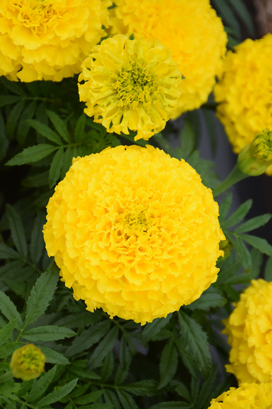 Proud Mari Yellow Marigold features bold double yellow ball-shaped flowers rising above the foliage from early summer to mid fall. The flowers are excellent for cutting. Its fragrant ferny leaves remain dark green in colour throughout the season.