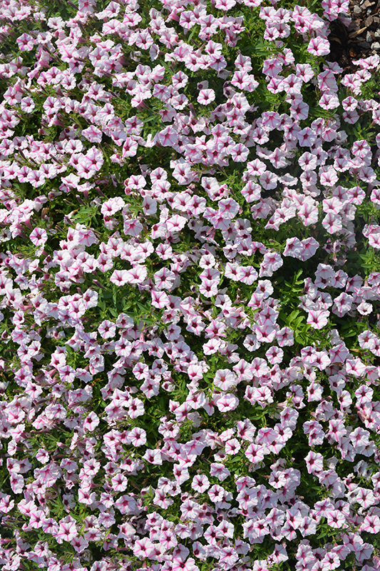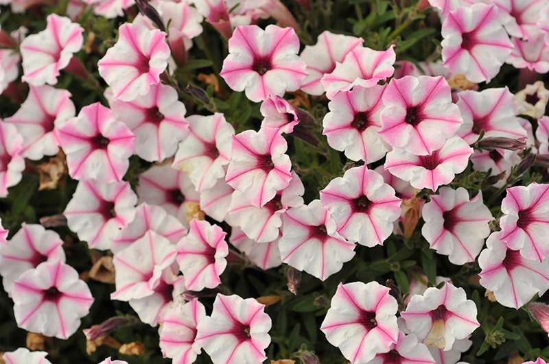 Supertunia Mini Vista® Pink Star Petunia is covered in stunning white trumpet-shaped flowers with pink overtones and hot pink veins at the ends of the stems from mid spring to mid fall. Its pointy leaves remain green in colour throughout the season.