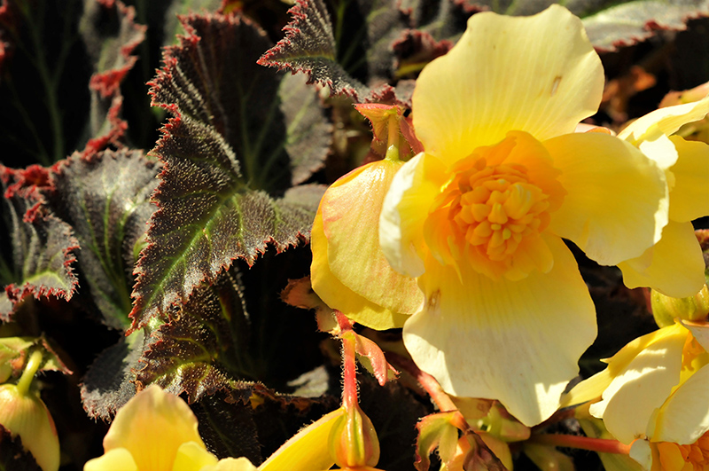 An outstanding trailing begonia presenting lovely deep green and burgundy leaves with toothed edges; large, sunshine yellow flowers are produced throughout the season; grows well in humid conditions; great spiller for containers, or hanging baskets