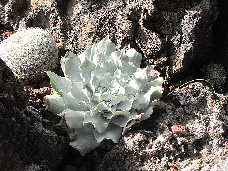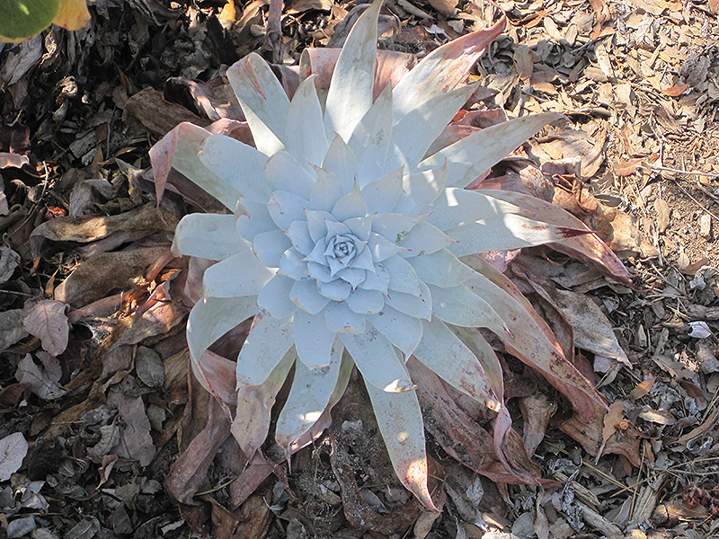 An outstanding succulent featuring a large rosette of chalky white leaves; coral spikes with red flowers in late spring; needs full sun on the coast but some shade inland; avoid watering in summer; great in containers, or in rock gardens
