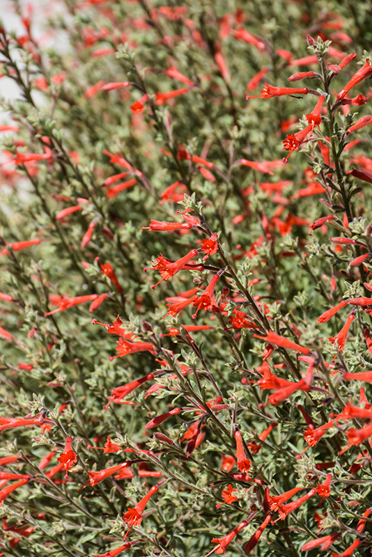 California Fuchsia features showy orange trumpet-shaped flowers with red overtones at the ends of the stems from late summer to mid fall. Its small tomentose narrow leaves remain grayish green in colour throughout the season.