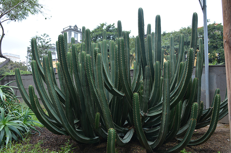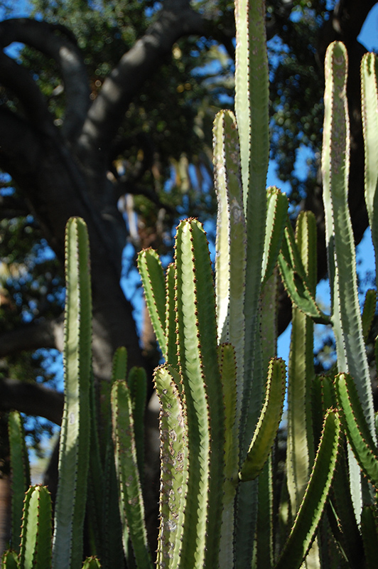 A visually striking succulent shrub featuring spiny, green vertical stems that arise from a base and form a solid clump; small reddish green flowers in mid to late spring; great for rock gardens, borders or containers; white sap is poisonous
