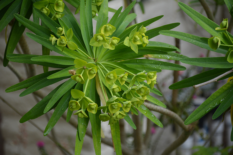 Tree Euphorbia has masses of beautiful clusters of lime green flowers with buttery yellow overtones and chartreuse bracts held atop the branches from late winter to mid spring, which are most effective when planted in groupings. It has attractive bluish-green evergreen foliage. The succulent narrow leaves are highly ornamental and remain bluish-green throughout the winter.