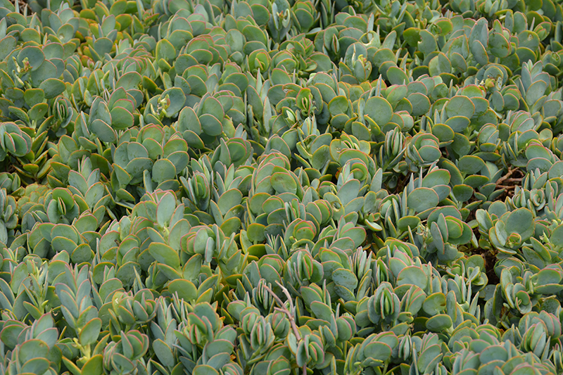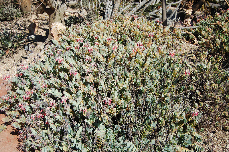 A compact, shrubby succulent featuring flat, blue-green rounded leaves that are oppositely arranged, and folded toward the branch tips; foliage takes on rose hues in winter; rose pink to red flowers dangle on stalks throughout the year