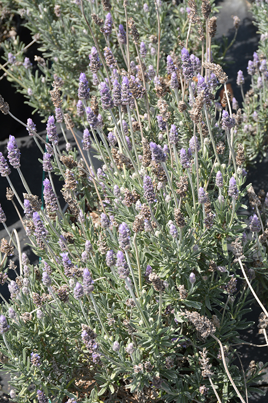 Gray Leaved French Lavender will grow to be about 32 inches tall at maturity, with a spread of 4 feet. Its foliage tends to remain dense right to the ground, not requiring facer plants in front. Although it's not a true annual, this slow-growing plant can be expected to behave as an annual in our climate if left outdoors over the winter, usually needing replacement the following year. As such, gardeners should take into consideration that it will perform differently than it would in its native habitat.