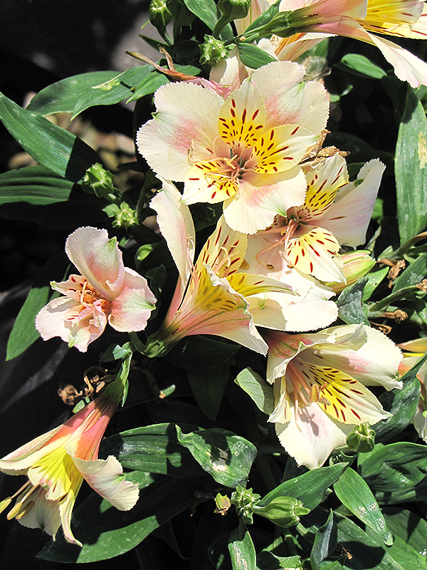 Little Miss™ Christina Alstroemeria features showy bracted creamy white trumpet-shaped flowers with pink overtones, yellow throats and burgundy spots at the ends of the stems from early summer to early fall. The flowers are excellent for cutting. Its pointy leaves remain dark green in colour throughout the season.
