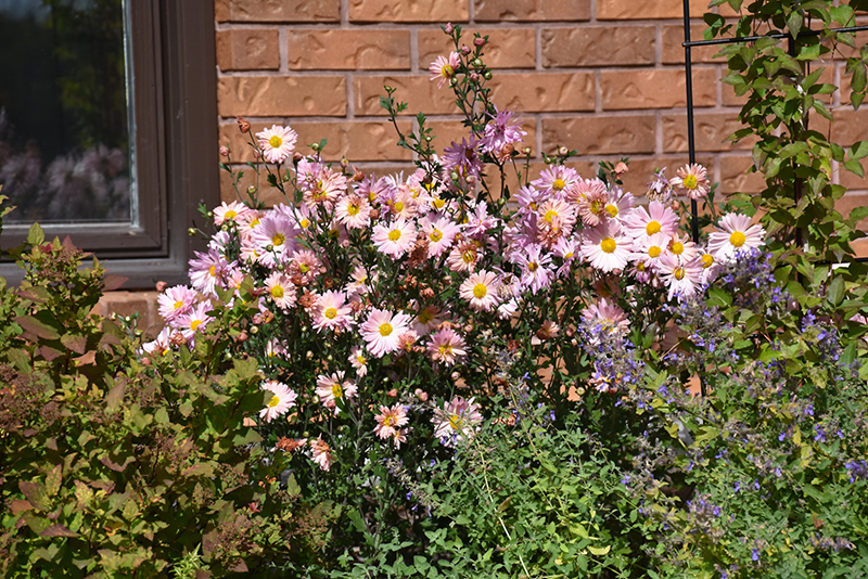 Hillside Sheffield Chrysanthemum is covered in stunning shell pink daisy flowers with white overtones, gold eyes and peach streaks at the ends of the stems from late summer to late fall, which emerge from distinctive coral-pink flower buds. The flowers are excellent for cutting. Its fragrant ferny leaves remain dark green in colour throughout the season.