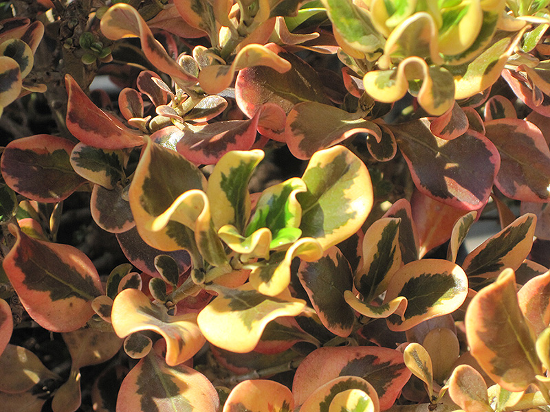 Emerging dark green foliage with yellow margins become intensely flushed with pink, orange and red, especially in winter months; an extraordinary variety perfect for shaping into topiaries or hedges; visually stunning