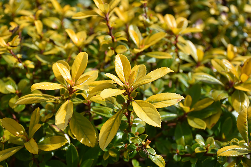 Gold Brian Escallonia will grow to be about 6 feet tall at maturity, with a spread of 6 feet. Its foliage tends to remain dense right to the ground, not requiring facer plants in front. Although it is technically a woody plant, this slow-growing plant can be expected to behave as a perennial in our climate if planted outdoors over the winter, usually regrowing from its base (crown) the following year. As such, gardeners should take into consideration that it will perform differently than it would in its native habitat.