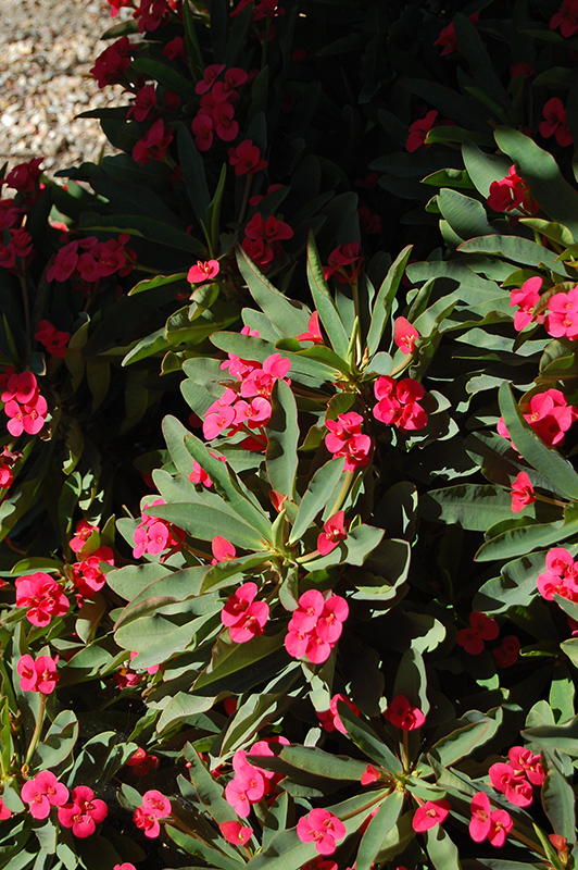Jerry's Choice Crown Of Thorns features showy clusters of scarlet flowers held atop the branches from early spring to late fall. It has attractive bluish-green evergreen foliage which emerges light green in spring. The oval leaves are highly ornamental and remain bluish-green throughout the winter.
