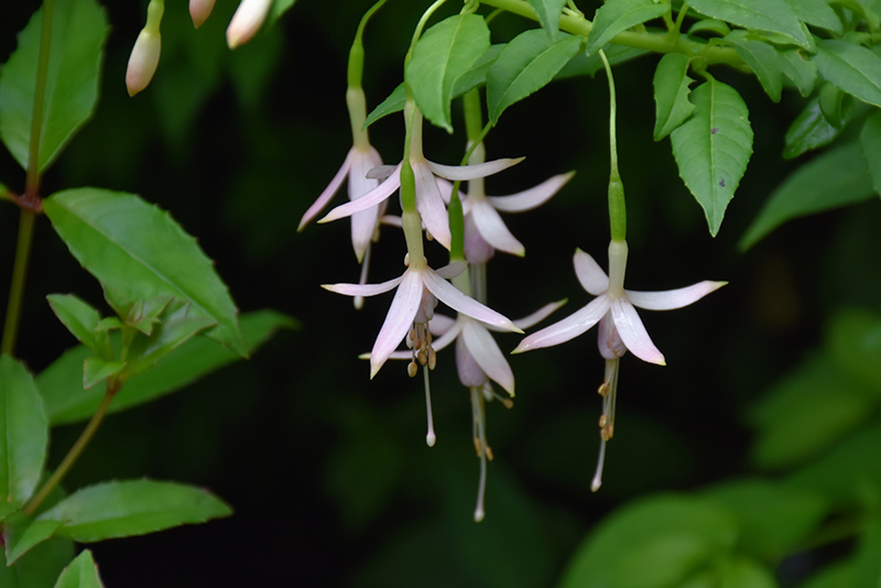 A bushy and upright, semi-evergreen, hardy fuchsia variety; features draped, nodding flowers of pale lilac with pinkish-white sepals, against contrasting green foliage; very attractive to hummingbirds; perfect for borders or containers