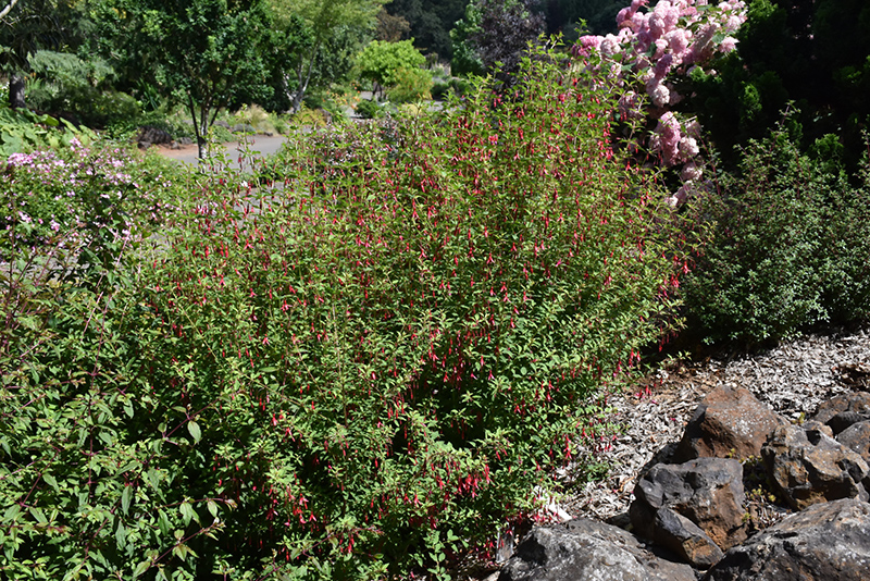 A bushy and upright, semi-evergreen, hardy fuchsia variety; features numerous, small nodding flowers of scarlet-red with dark purple centers, beneath dainty green foliage; very attractive to hummingbirds; perfect for borders or containers