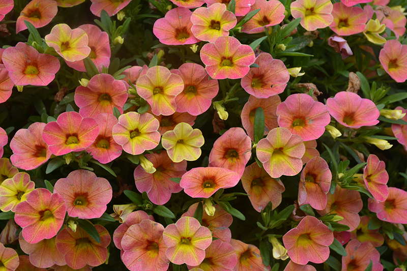 Cha-Cha™ Diva Apricot Calibrachoa is blanketed in stunning yellow trumpet-shaped flowers with peach overtones and coral-pink veins at the ends of the stems from late spring to early fall. Its small narrow leaves remain green in colour throughout the season.