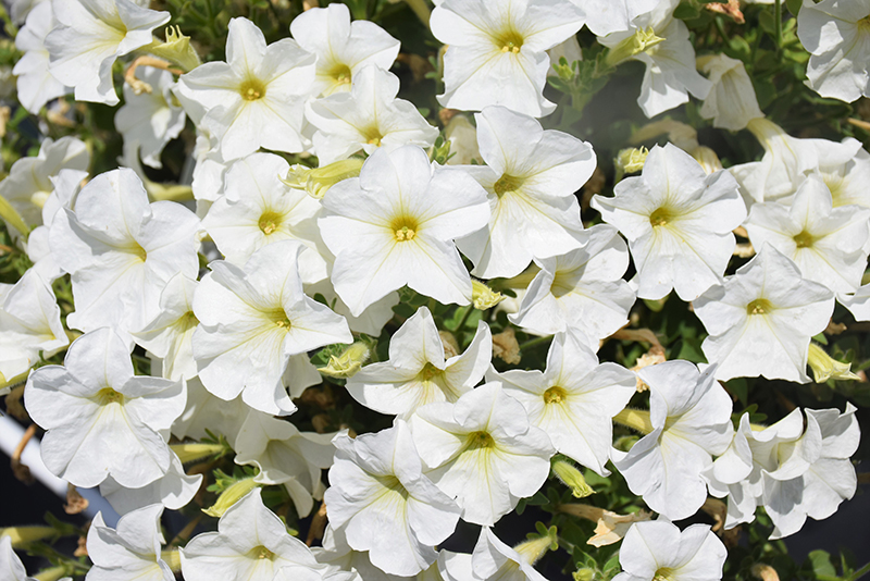 A wonderful extra early flowering and fast growing variety that blooms freely all season; these tidy spreading petunias produces masses of miniature bright white blooms that look stunning in hanging baskets, combination planters and borders