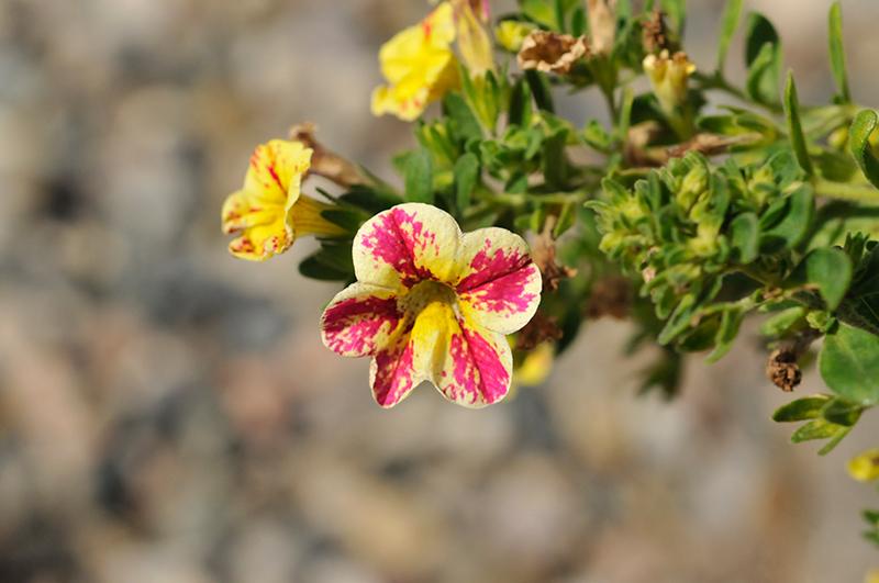 Candy Shop® Chocolate Calibrachoa is covered in stunning fuchsia trumpet-shaped flowers with gold throats and yellow stripes at the ends of the stems from late spring to early fall. Its small pointy leaves remain green in colour throughout the season.