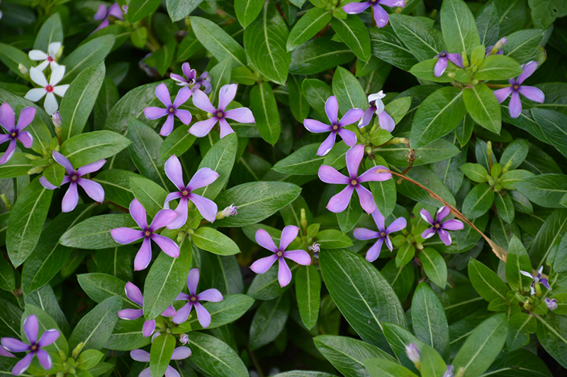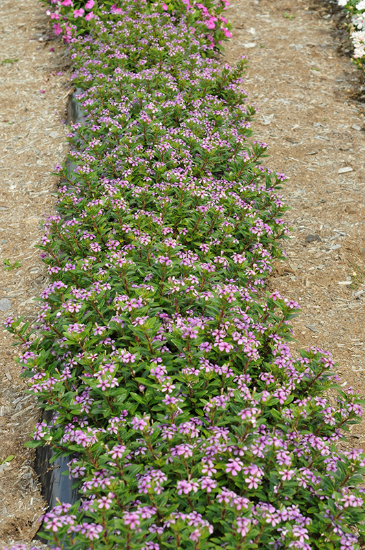 Soiree® Kawaii Blueberry Kiss Vinca will grow to be about 10 inches tall at maturity, with a spread of 18 inches. Its foliage tends to remain low and dense right to the ground. Although it's not a true annual, this fast-growing plant can be expected to behave as an annual in our climate if left outdoors over the winter, usually needing replacement the following year. As such, gardeners should take into consideration that it will perform differently than it would in its native habitat.