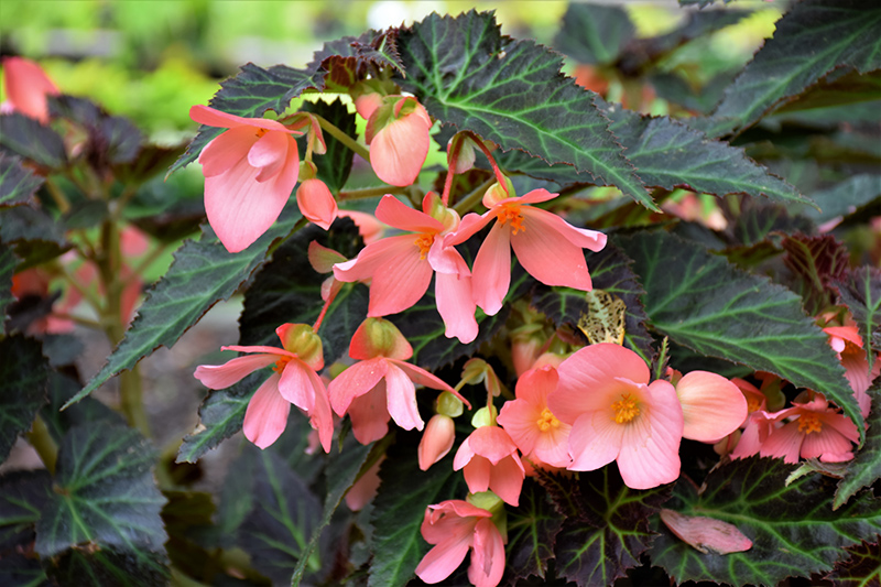 Unstoppable Upright Salmon Begonia features dainty salmon orchid-like flowers at the ends of the stems from mid spring to mid fall. Its attractive succulent heart-shaped leaves remain dark green in colour with distinctive light green veins and tinges of red throughout the year.