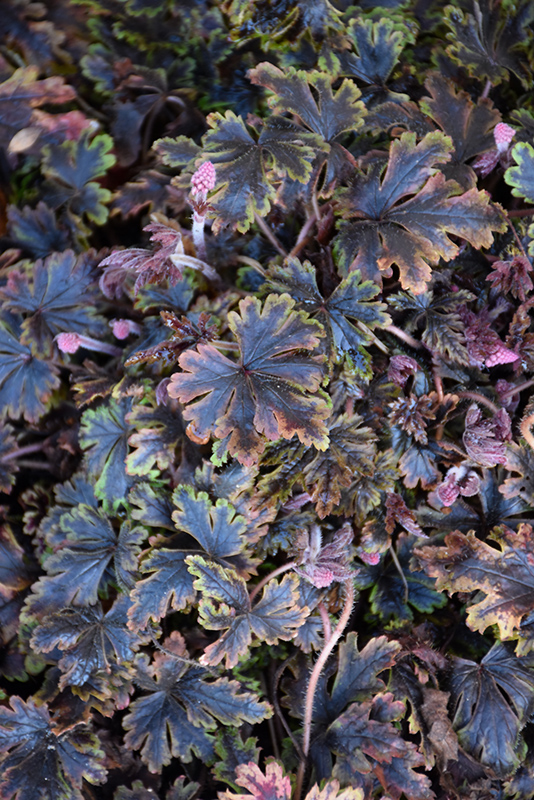 A striking selection, with its white flower spikes in spring, over interesting, lobed and deeply cut leaves patterned with dark burgundy veins; foliage turns red-orange in fall; wonderful as a shaded groundcover, or mixing with other plants in a container