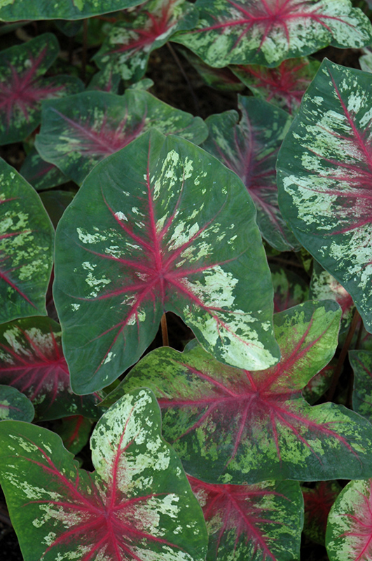 Heart to Heart™ Flatter Me Caladium's attractive heart-shaped leaves remain light green in colour with distinctive hot pink veins and tinges of dark green throughout the season on a plant with a mounded habit of growth.