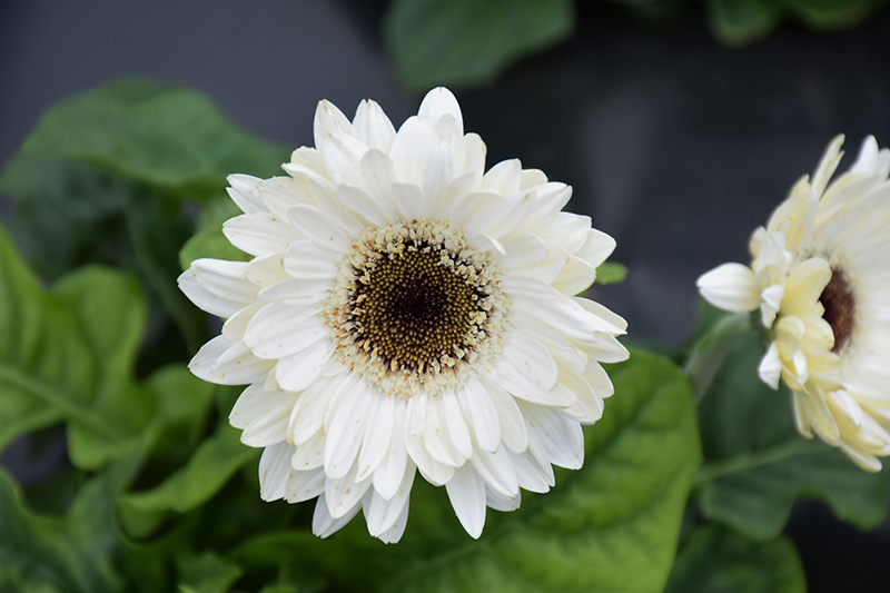 Majorette Bright White Dark Eye Gerbera Daisy features bold semi-double white daisy flowers with dark brown eyes at the ends of the stems from mid spring to mid fall. The flowers are excellent for cutting. Its tomentose oval leaves remain green in colour throughout the season.