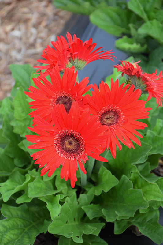 Flori Line Maxi Red Black Center Gerbera Daisy features bold semi-double red daisy flowers with black eyes at the ends of the stems from mid spring to mid fall. The flowers are excellent for cutting. Its oval leaves remain green in colour throughout the season.