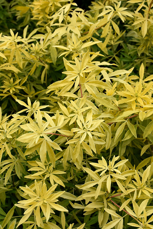 A compact, rounded evergreen shrub with narrow, bright yellow to light green young foliage; clusters of small, white, fragrant flowers appear in spring, and sometimes again in late summer; great as an accent, or hedging