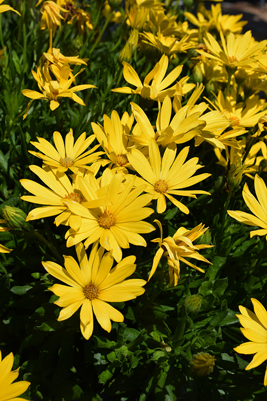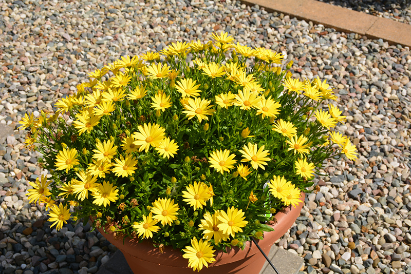 Ostica™ Glamour Osteospermum features showy yellow daisy flowers with gold eyes at the ends of the stems from late spring to mid fall. The flowers are excellent for cutting. Its pointy leaves remain green in colour throughout the season.