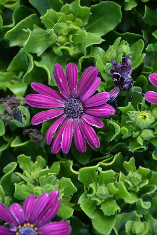 Ostica™ Midnight Osteospermum features showy deep purple daisy flowers with indigo eyes at the ends of the stems from late spring to mid fall. The flowers are excellent for cutting. Its pointy leaves remain green in colour throughout the season.