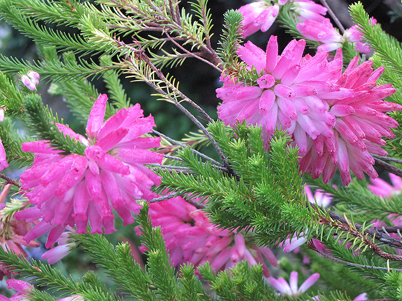 Whorl Heath features showy clusters of rose tubular flowers with pink overtones at the ends of the branches from mid spring to mid fall. It has green evergreen foliage. The tiny needles remain green throughout the winter.