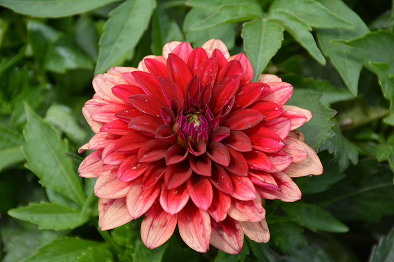 Lubega® Power Red Dahlia features showy double red daisy flowers at the ends of the stems from early summer to mid fall. The flowers are excellent for cutting. Its pointy leaves remain green in colour throughout the season.