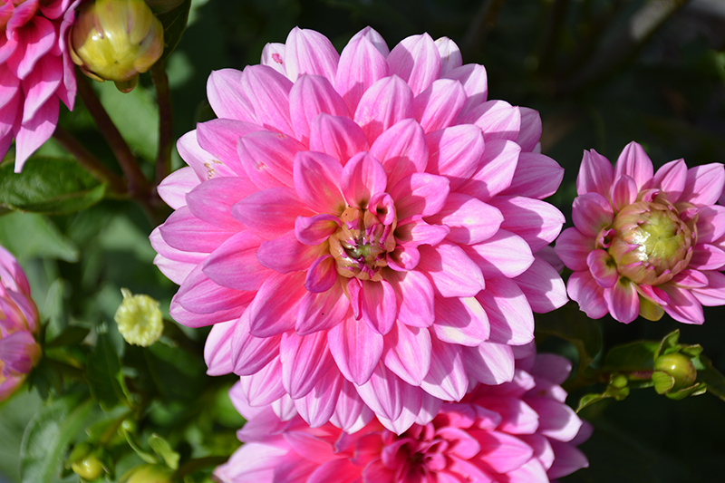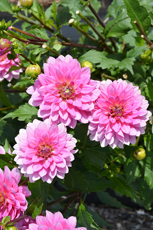 XXL Paraiso Dahlia features showy double pink pincushion flowers at the ends of the stems from mid to late summer. The flowers are excellent for cutting. Its serrated pointy leaves remain green in colour throughout the season.