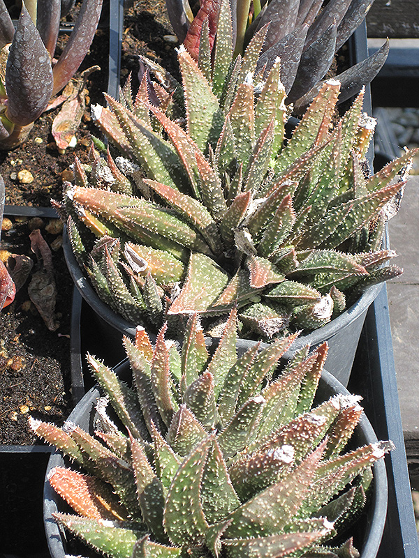 This Aloe and Gasteria hybrid features toothed and speckled rosettes of dark green leaves, that may flush copper at the tips in extreme weather; produces erect racemes of orange flowers at varying times; a wonderful garden or container accent
