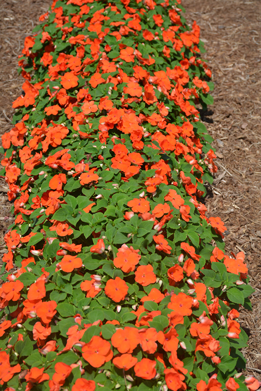 Xtreme™ Orange Impatiens will grow to be about 8 inches tall at maturity, with a spread of 10 inches. When grown in masses or used as a bedding plant, individual plants should be spaced approximately 10 inches apart. Its foliage tends to remain low and dense right to the ground. This fast-growing annual will normally live for one full growing season, needing replacement the following year.